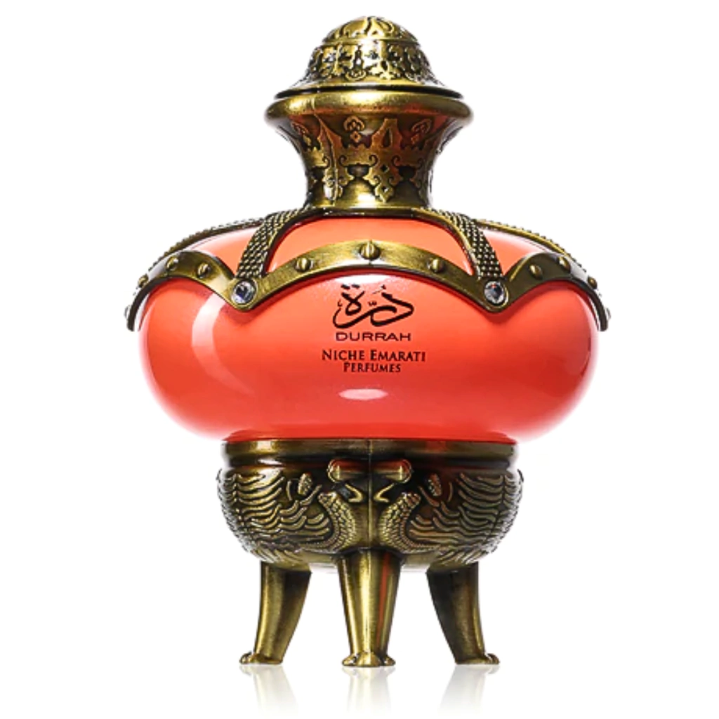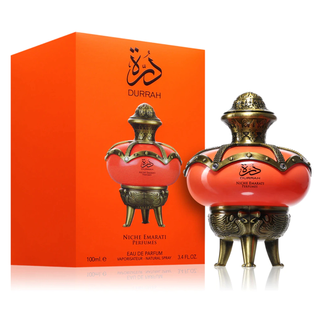 Durrah de Lattafa Perfumes é um perfume Floral Frutado Gourmet Compartilhável. As notas de topo são: Hibisco, Bergamota e Lichia. As notas de coração são: Magnólia, Violeta, Rosa e Olíbano. As notas de fundo são: Baunilha, Âmbar e Almíscar.