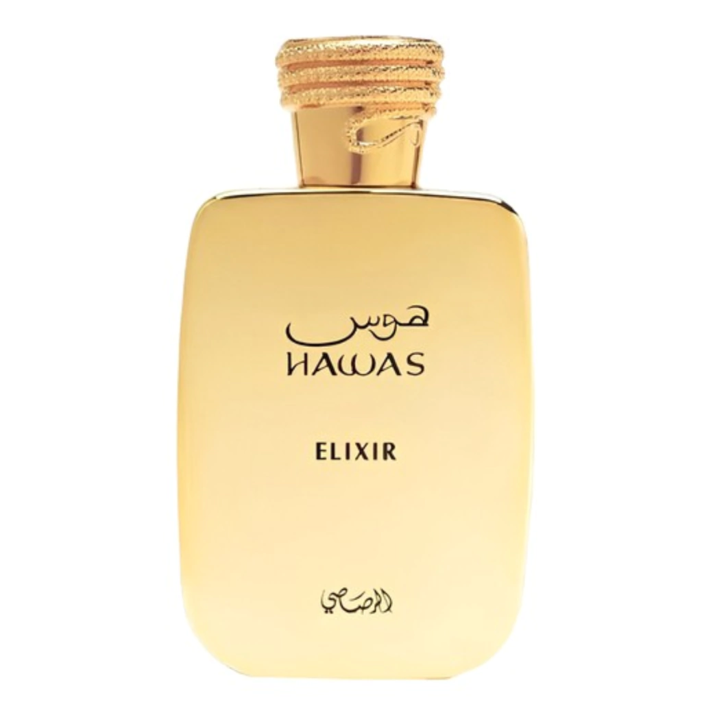 Hawas Elixir de Rasasi é um perfume Oriental Baunilha Compartilhável. Esta é uma nova fragrância. Hawas Elixir foi lançada em 2024. As notas de topo são: Hortelã, Bergamota e Artemísia. As notas de coração são: Chocolate amargo, Lavanda e Benjoim. As notas de fundo são: Baunilha, Fava Tonka e Almíscar Branco.